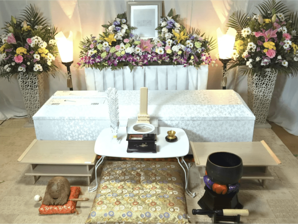 生花アレンジが多数と遺影写真が付いておりお寺様や会葬者はスタッフが対応します。