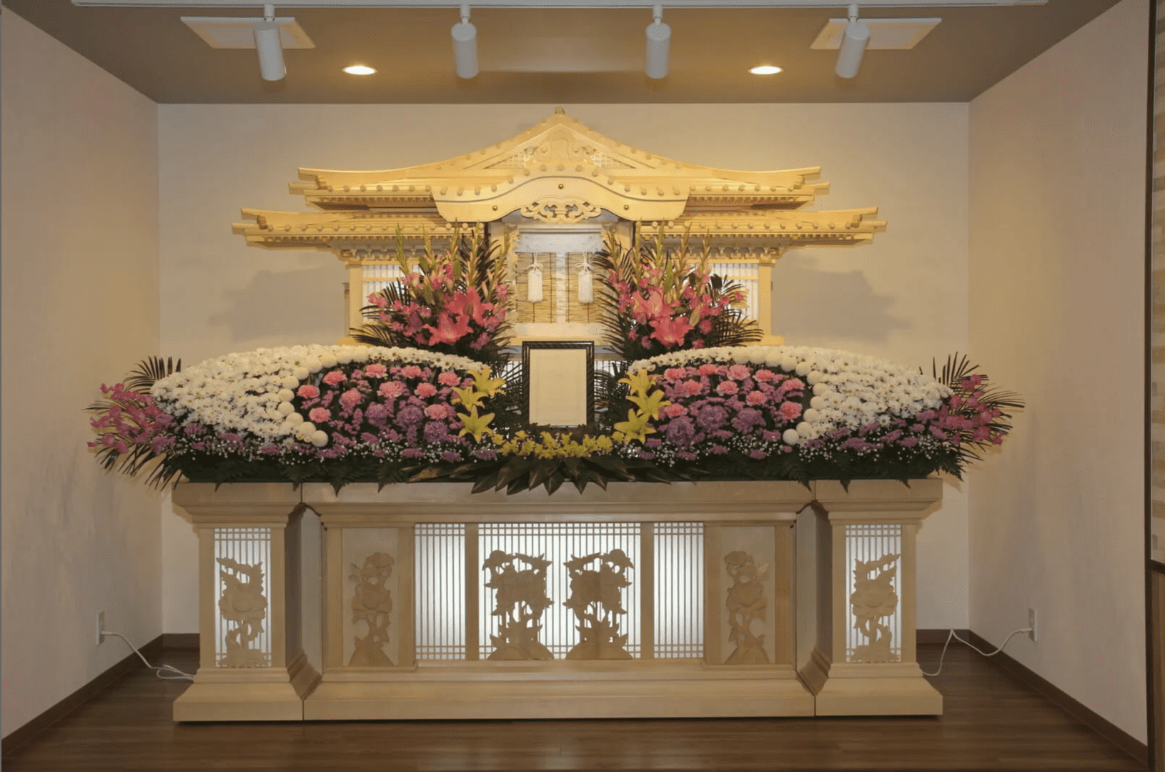 一般的な葬儀を家族で暖かく行いたい 小規模でも華やかに送ってあげたい 一般葬を最小限の費用で行いたい 通常価格962,500円税込 会員価格70万円 税込価格770,000円 お迎え(自宅枕経→斎場)→通夜→お葬儀→火葬場 受付 ご遺族用控え室(和室) 最大30名 プランに含まれるもの 自宅配送 自宅安置 ドライアイス 枕飾り一式 線香ろうそく 棺/布団 *1 仏衣一式 運営スタッフ 白木位牌 三角1対 受付セット 焼香セット 司会スタッフ 遺影写真 *3 奥3連アレンジ花 喪中案内看板 処置納棺/湯灌 火葬場搬送 役所手続き 骨壺・箱 後段飾一式 *4 1 上級棺 *3 フレーム付き2枚 *5 上飾りさいじょうで